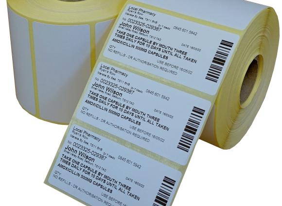 Plain white, matt direct thermal labels finished in a wide edge leading format with permanent adhesive. 1,000 labels per roll on a 25mm core.